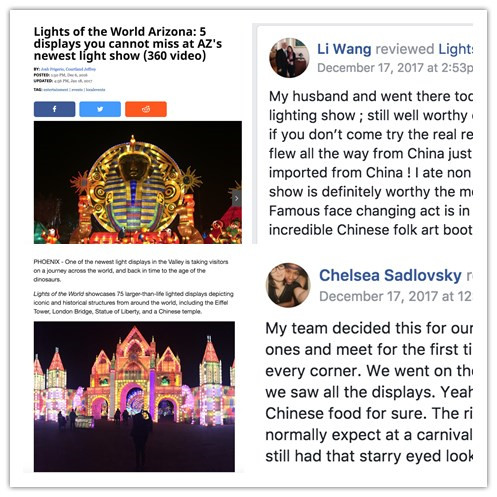 本次燈展是東方彩燈繼2016第一次成功舉辦美國菲尼克斯彩燈嘉年華的再次完美呈現(xiàn)。2017美國菲尼克斯彩燈嘉年華,自開展以來備受美國當(dāng)?shù)孛癖姛崤鹾透鞔笾髁髅襟w關(guān)注、在facebook等社交平臺更是掀起了中國彩燈熱潮,菲尼克斯當(dāng)?shù)匦侣劇?Now @ 6 》報(bào)道稱“2017世界之光彩燈嘉年華是北美最大的彩燈節(jié),是全球文化集合地,游客仿佛置身于迪士尼中。”