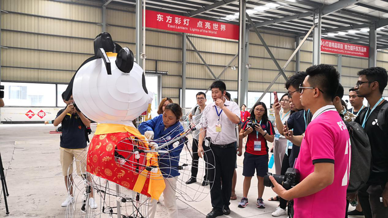 走進(jìn)東方彩燈出口基地,來到“東方彩燈 點(diǎn)亮世界”項(xiàng)目境外燈展制作現(xiàn)場,青年朋友們近距離的詳細(xì)了解了彩燈的制作流程和工藝。交流團(tuán)成員為東方彩燈足跡遍布世界30多個國家咋咋稱奇,為燈貿(mào)集團(tuán)精妙絕倫的彩燈頻頻點(diǎn)贊。