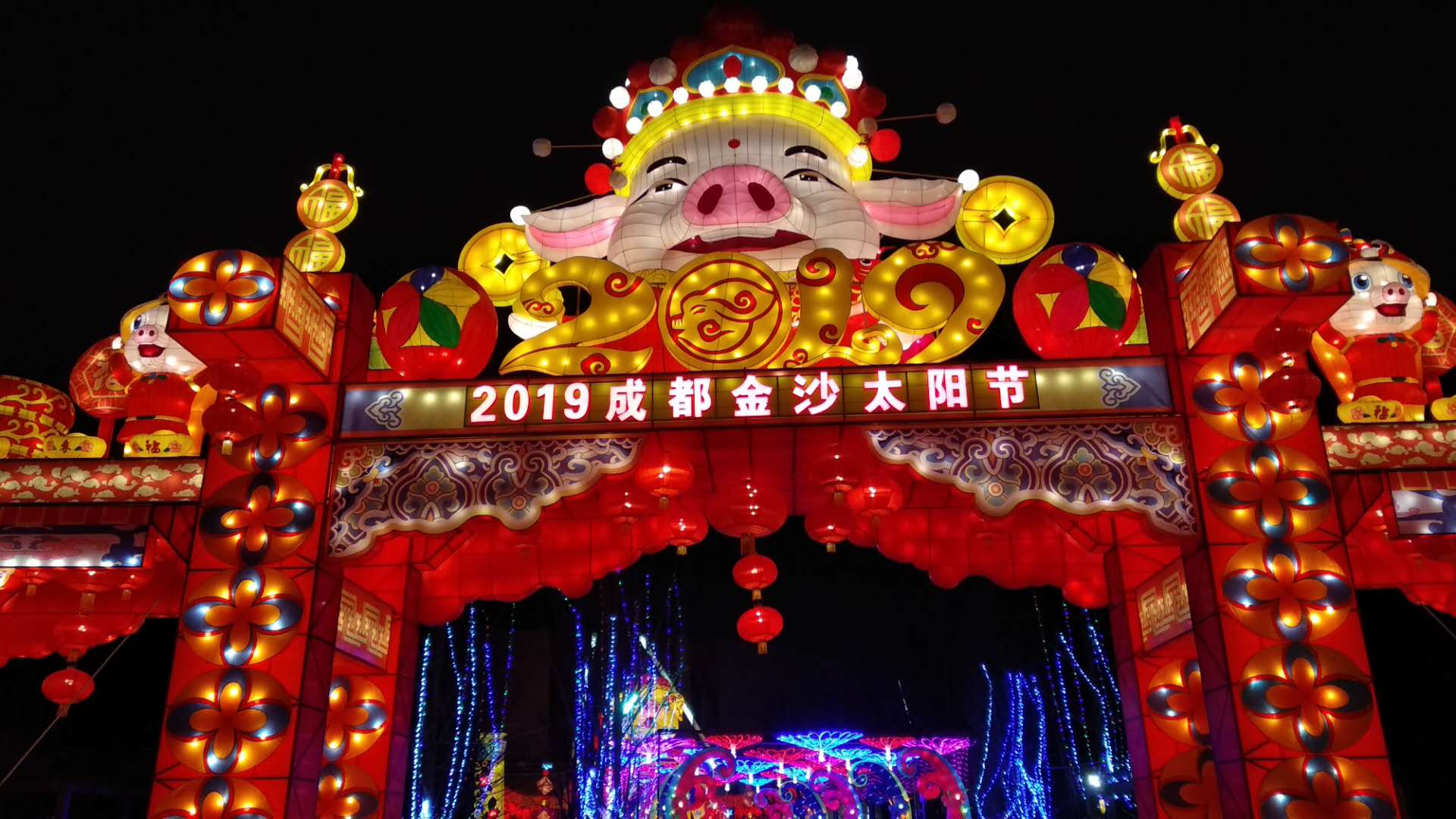 金沙太陽節(jié)史上最大的立體生肖造型,卡通豬組合燈組“金豬賜?!?,向游客傳遞豬年的美好祝福。“人逢盛世情無限,豬拱華門歲有余”,歡樂祥瑞的金豬將福澤灑滿天府大地。