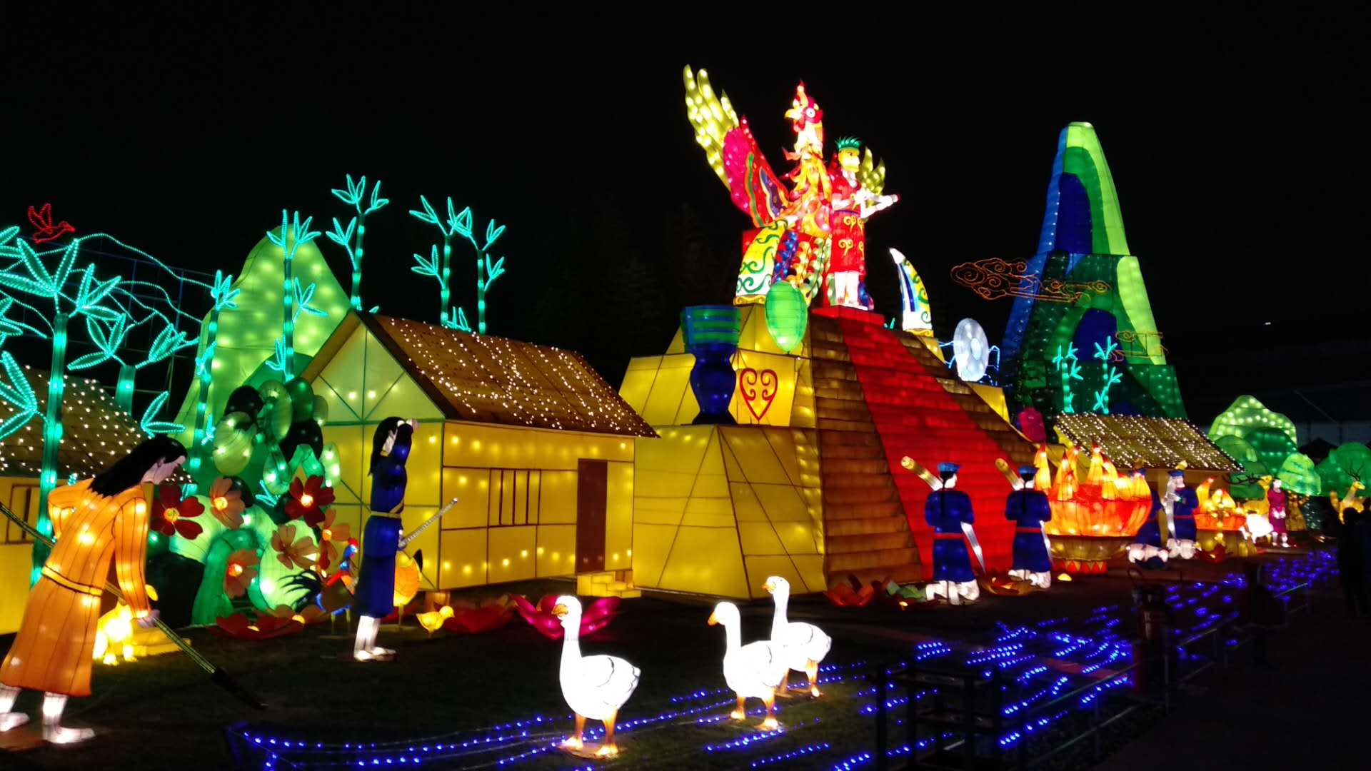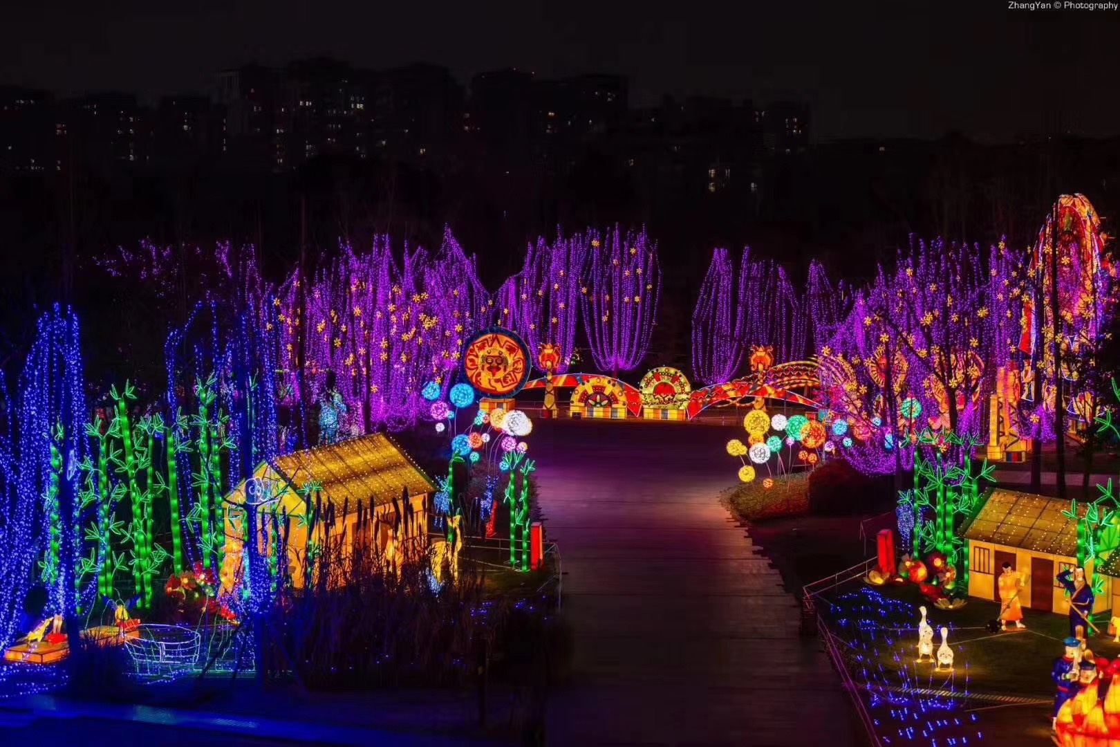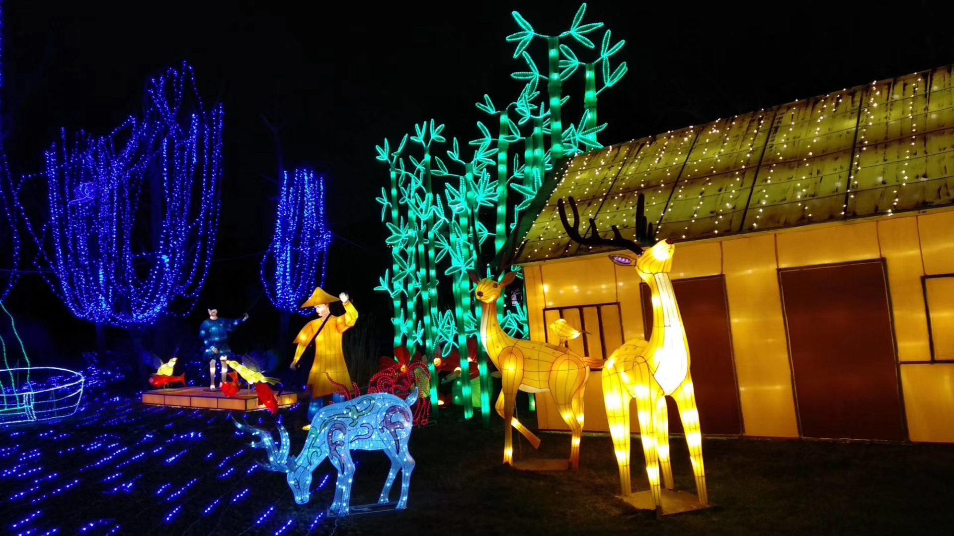 遺跡館外的“古蜀家園”也是本屆太陽節(jié)規(guī)模較大的燈組之一。竹林、小屋、麋鹿等景觀再現(xiàn)古蜀國的自然生態(tài)環(huán)境。彩燈刻畫出一組一組栩栩如生的景色,再現(xiàn)古蜀生活時(shí)的盛大場(chǎng)景。