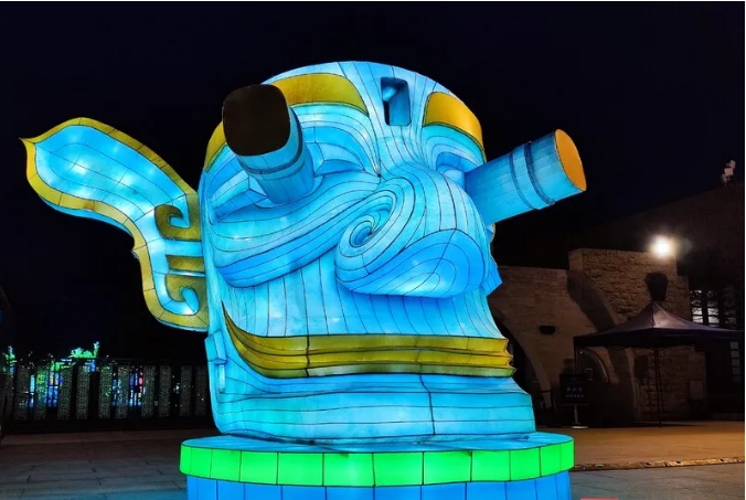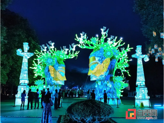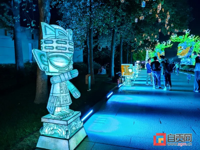 這次燈展由中青旅聯(lián)科策劃、自貢燈貿(mào)集團(tuán)打造,設(shè)計(jì)靈感都來自于三星堆實(shí)體文物、考古發(fā)現(xiàn),包括包括青銅大立人、青銅縱目面具、青銅神樹、黃金面具、青銅神鳥等。