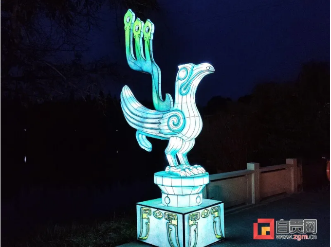 鳥與古蜀的關(guān)系十分密切,三星堆館藏文物中有眾多的鳳鳥形器物及紋飾圖案,在此次燈展中,也有不少以鳥為元素進(jìn)行設(shè)計(jì)。其中一組以青銅鳳鳥為設(shè)計(jì)原型的燈組,兩只相似但不相同的高2.8米的鳳鳥燈組立于入口兩側(cè)通道處。