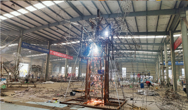 走進燈貿(mào)集團生產(chǎn)現(xiàn)場,呈現(xiàn)眼前的是一篇繁忙景象。近200名東方彩燈的工匠按照放樣、造型、噴涂、電器安裝、裱糊、美術(shù)處理等生產(chǎn)流程,井然有序、熱火朝天地開展生產(chǎn)。但見,造型師焊槍焰火、飛火流星;電器師神工妙力,串接璀璨;裱糊師巧奪天工,斑斕溢彩;美術(shù)師鬼斧神工,爐火純青......
